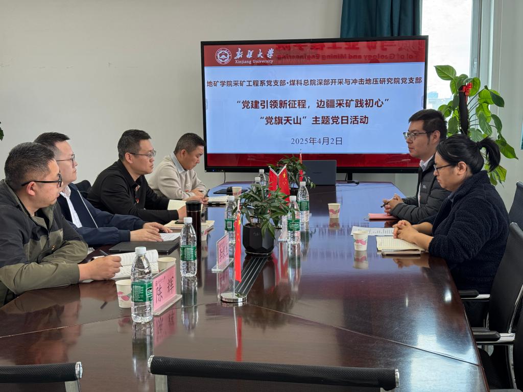 为进一步推动党建与科研工作深度融合,促进跨学科合作交流,4月2日下午,公司采矿工程系党支部开展 “ 党建引领新征程 边疆采矿践初心 ”“ 党旗映天山 ” 主题党日活动。 此次活动特邀 煤炭科学研究总院深部开采与冲击地压研究院 负责人 杨冠宇 及 其 深地实验室负责人石晓闪 参加 ,采矿工程系党支部书记管伟明、 支部 委员及 支部党员 参加活动。